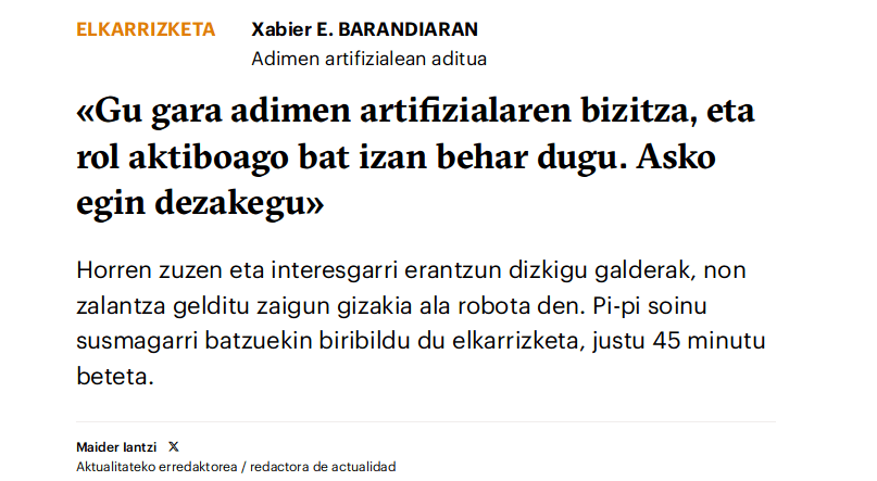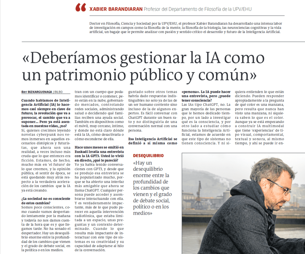 - NEWSPAPER INTERVIEW: «Deberíamos gestionar la Inteligencia Artificial como un patrimonio público y común«: An interview with I. Bizkarguenaga for Gara (January 16, 2023), advocating for AI as a public heritage.